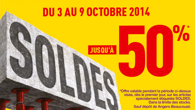 Mis à part le magasin d’Angers-Beaucouzé qui n’aura pas cette chance (surtout ses clients), Brico Dépôt lance une opération SOLDES du 3 au 9 octobre prochain à travers toute la France… Des centaines d’articles seront en promotion et leur prix pourra atteindre des remises jusqu’à -50 %. Evidemment ces soldes seront dans la limite des stocks disponibles.