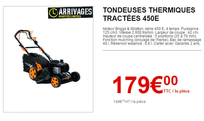 La tondeuse à gazon tractée proposée dans les derniers arrivages Brico Dépôt possède un moteur thermique 4 temps Briggs & Stratton d’une cylindrée de 125 cm3. Sa vitesse est de 2 800 tours par minute. Avec une largeur de coupe de 42 cm, une hauteur de coupe réglable de 25 à 70 mm (5 positions), elle est dotée d’une fonction broyage de l’herbe, d’un bac de ramassage et elle est garantie 2 ans. Le tout pour seulement 179€ !